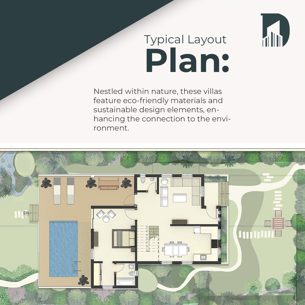 Winding pathways, lush green areas, tranquil water bodies, and a charming gazebo create a seamless connection to the outdoors. The villa’s highlight is a private swimming pool with a wooden deck, perfectly situated to take in the breathtaking wilderness views. This thoughtfully crafted space is where design meets nature, offering an idyllic escape in the lap of luxury.