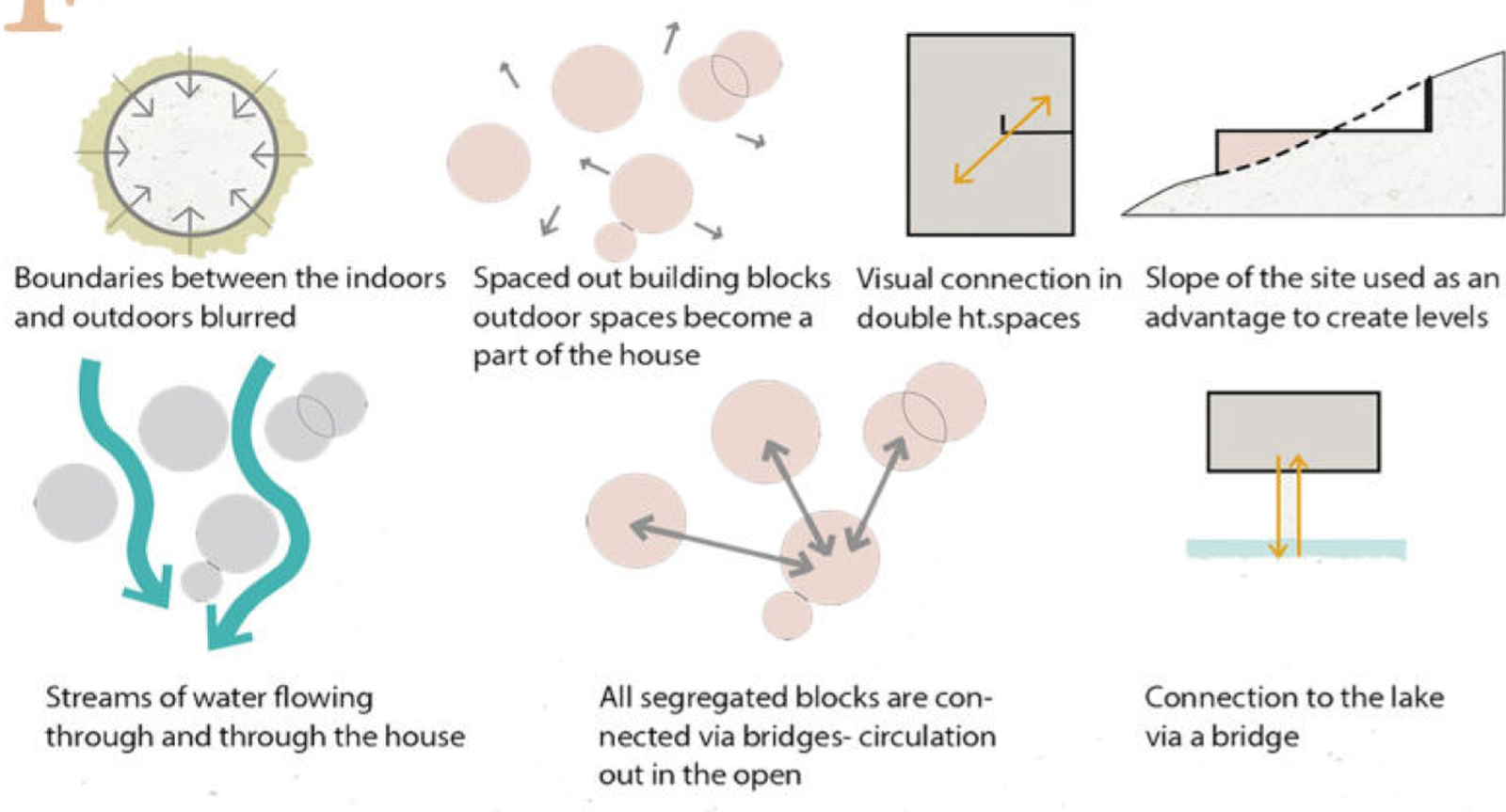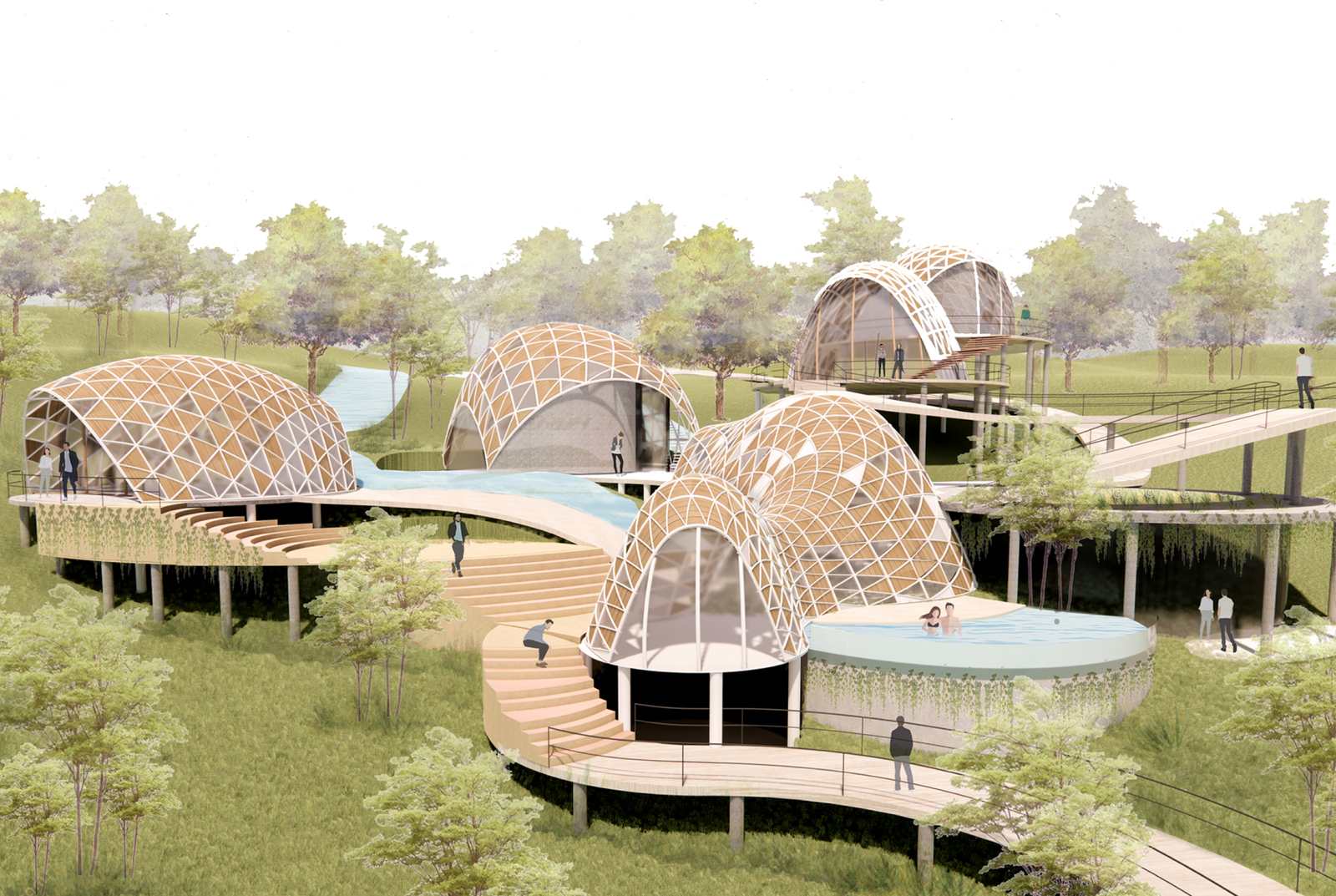 The complex includes multiple levels connected by curved walkways and staircases, with some areas elevated on stilts to minimize environmental impact. The setting includes water features and greenery, blending seamlessly with the natural surroundings. The design is innovative and relevant for its sustainable approach to architecture, integrating modern living spaces with nature