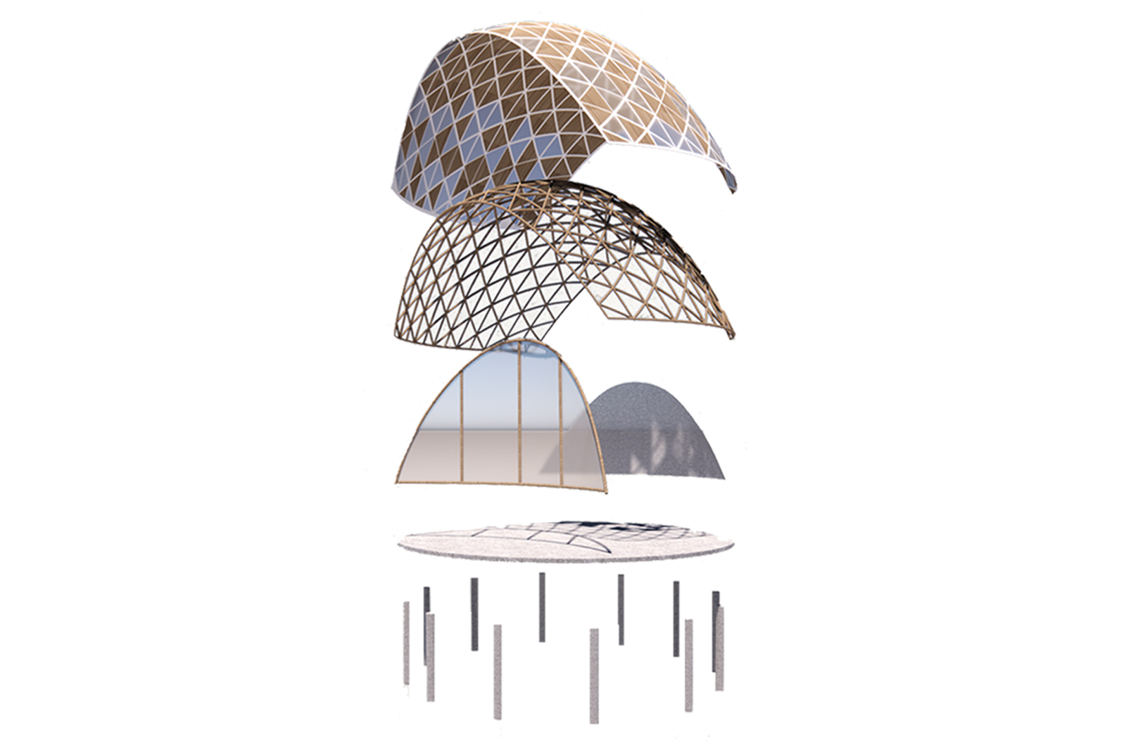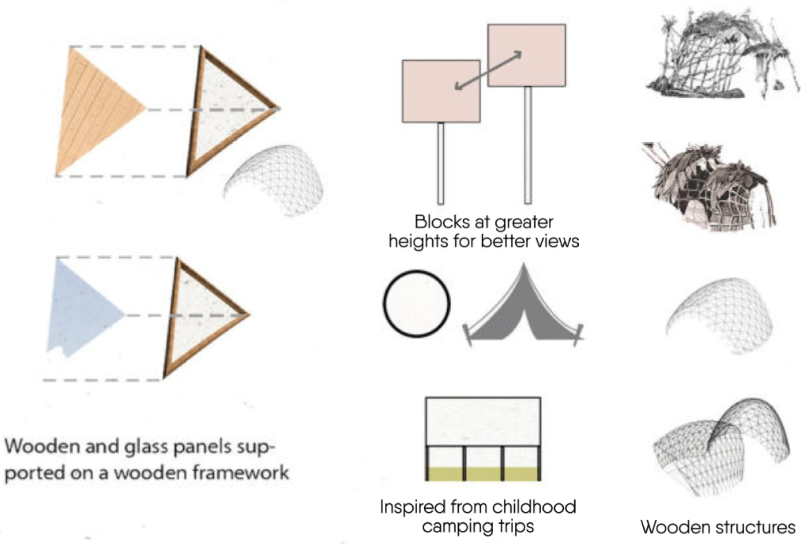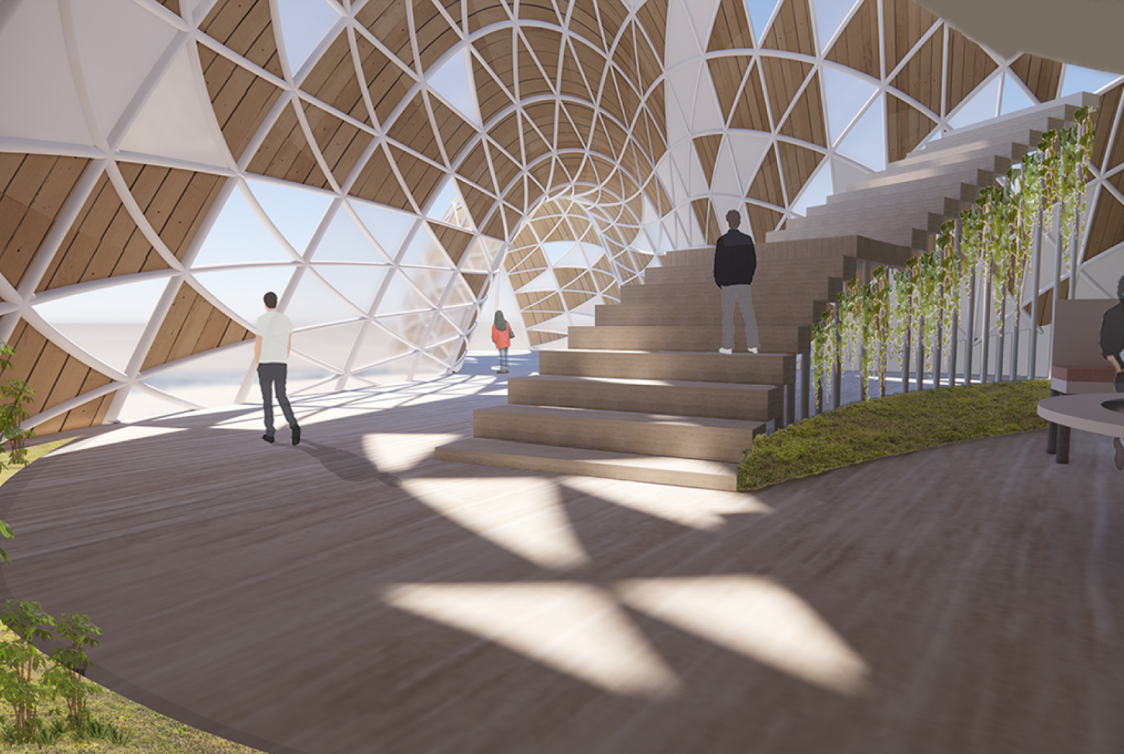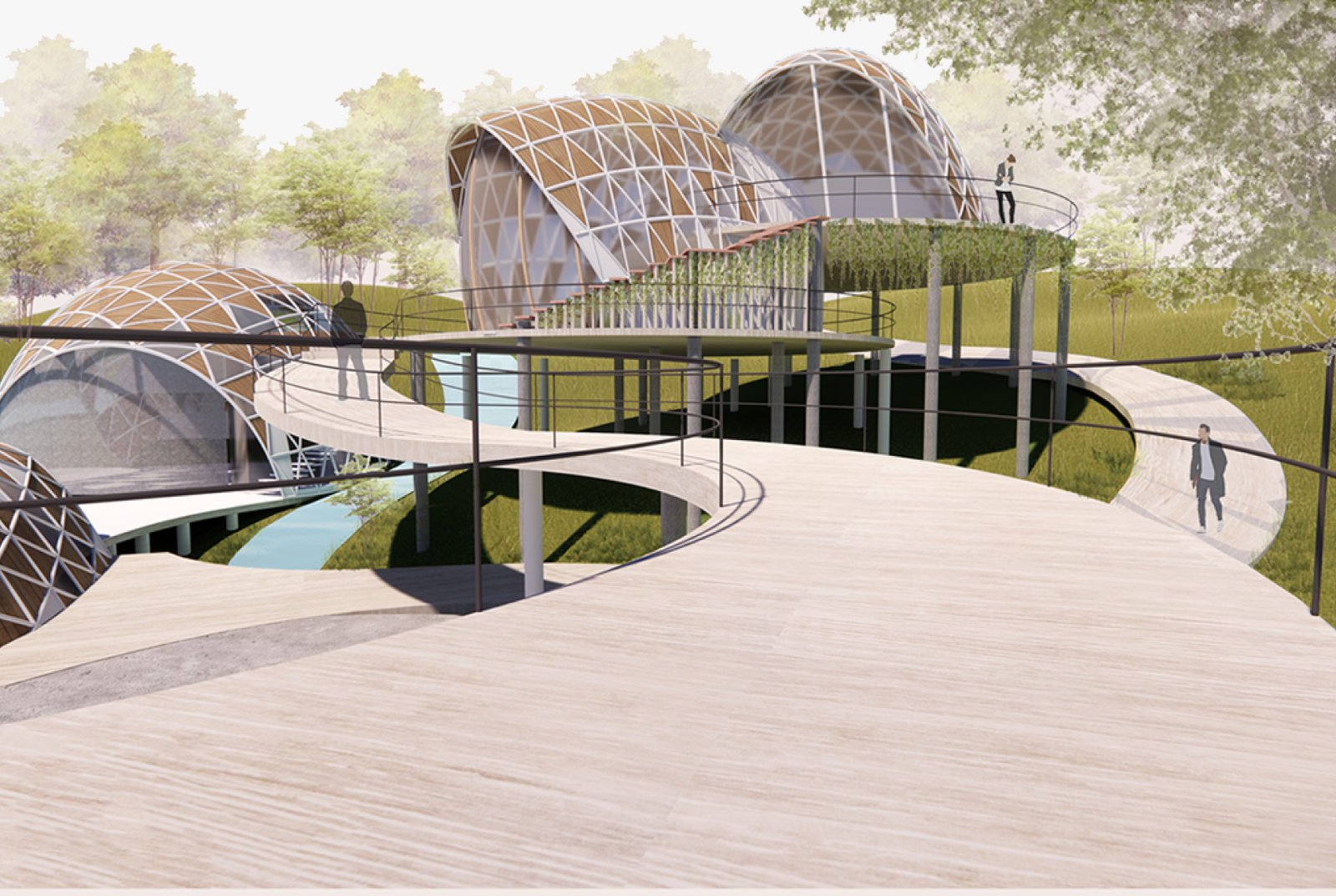 A playful public recreational space for modern architectural design featuring a series of interconnected dome structures situated in a lush, green environment. The domes are constructed with a geometric lattice framework, made of sustainable materials such as wood or bamboo, emphasizing eco-friendly design principles.